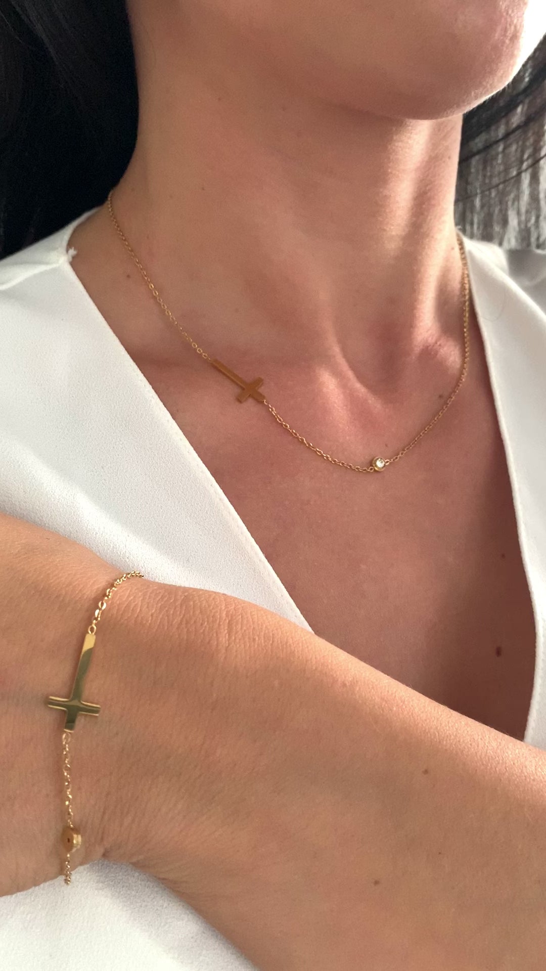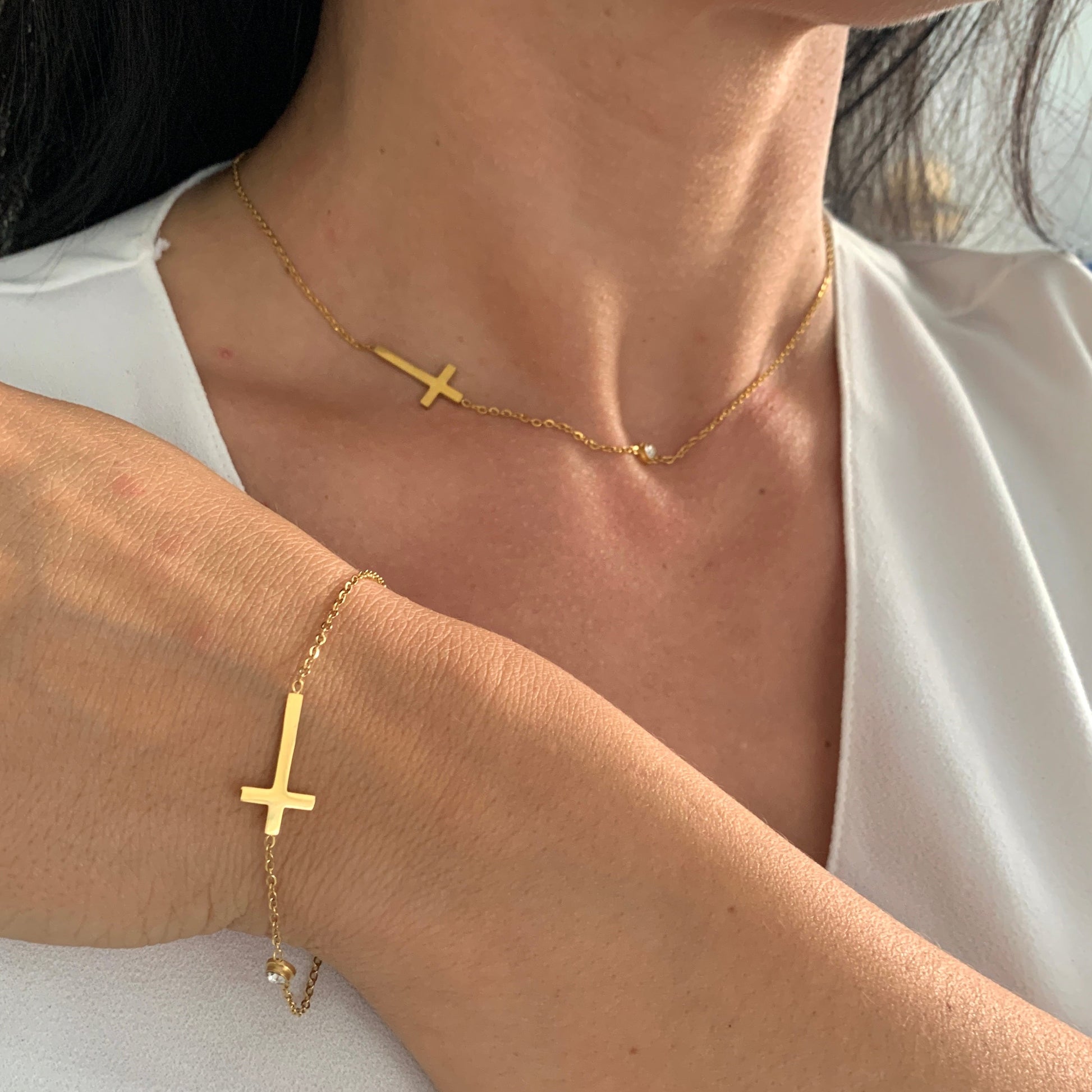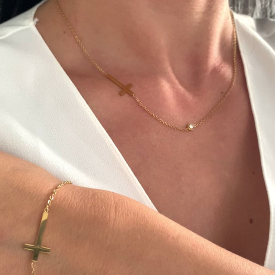 Dieses minimalistische Kreuz-Schmuckset bestehend aus Halskette und Armband verbindet klare Formen mit spiritueller Symbolik.