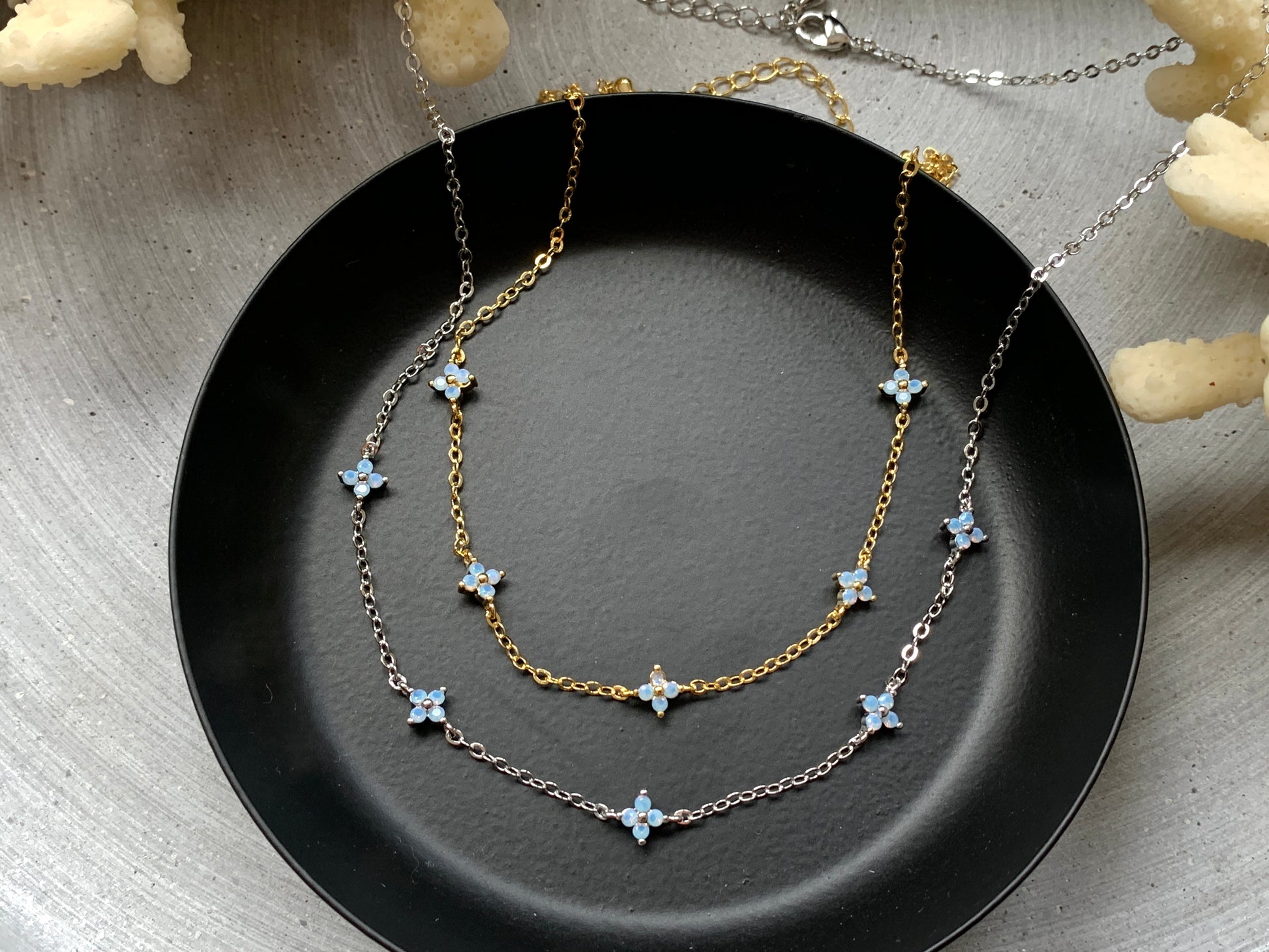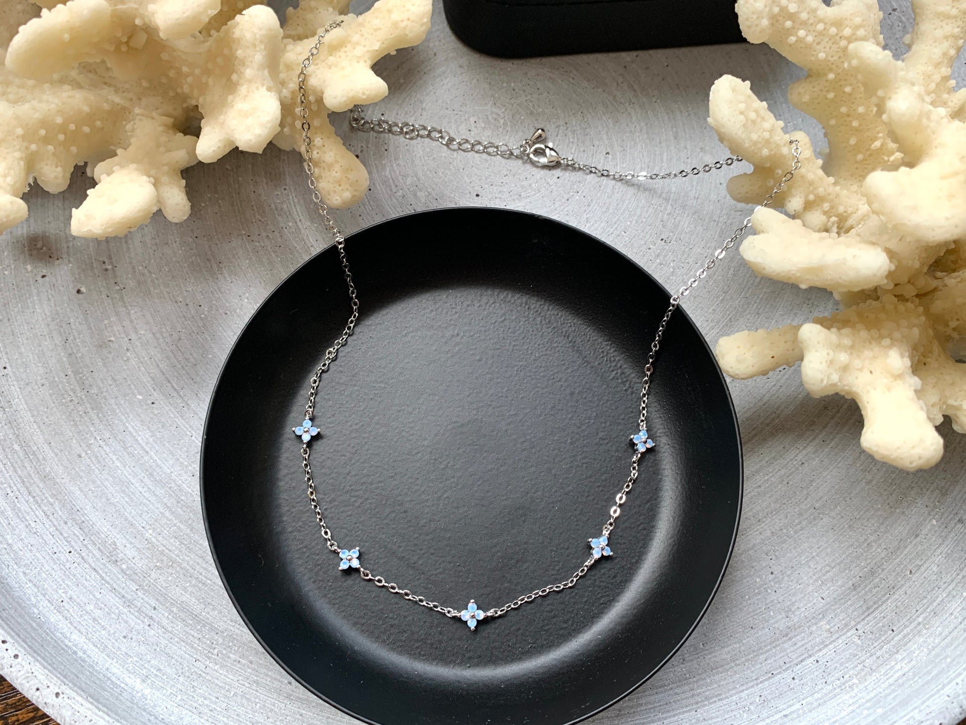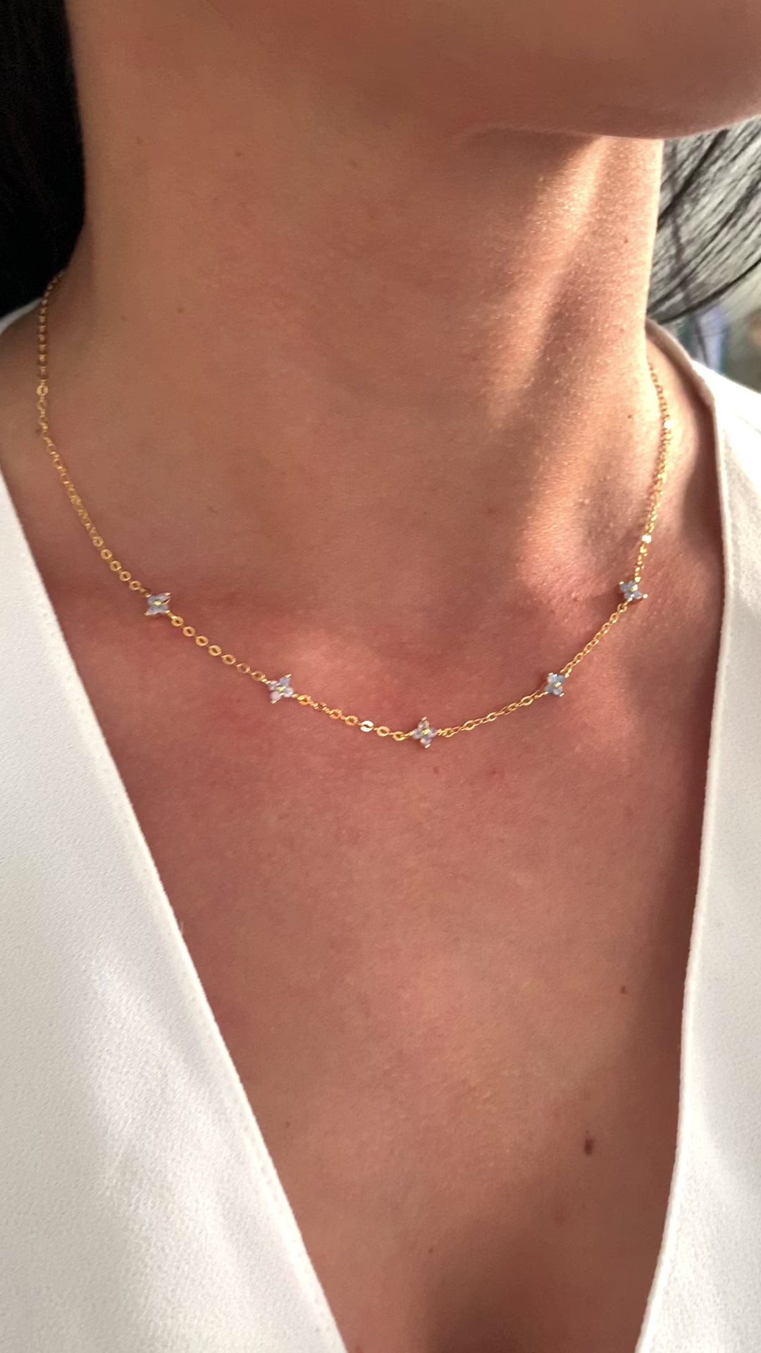 Diese minimalistische Halskette mit blauen Blüten-Charms verbindet feine Zurückhaltung mit einem sanften Farbakzent.
